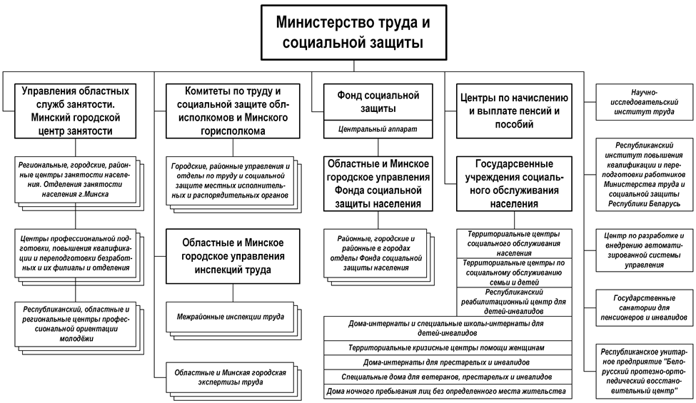 Системообразующим центром социальной сферы в Республике Беларусь является Министерство труда и социальной защиты, в состав которого ряд структурных подразделений разного уровня и соответствующих направлений деятельности (см. рис. 1.2).